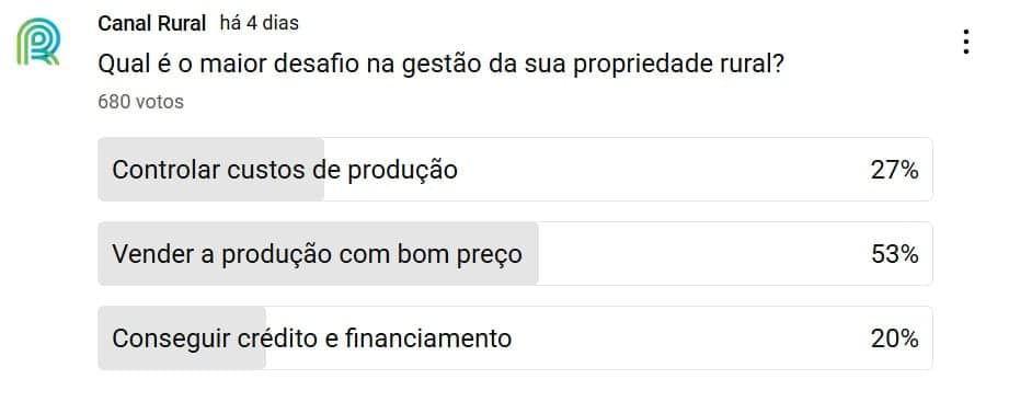 Na interatividade da semana perguntamos: Qual é o maior desafio na gestão da sua propriedade rural? O resultado mostrou que o maior desafio na gestão de propriedades rurais é vender a produção com bom preço. Entre os produtores que votaram, 53% apontaram essa dificuldade como a principal no dia a dia do campo. Já 27% destacaram o controle dos custos de produção e 20% citaram o acesso a crédito e financiamento.
