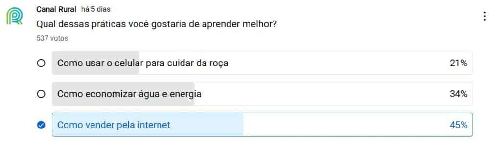 Na interatividade da semana perguntamos aos produtores, quais práticas gostariam de aprender? Dentre as 3 opções, o resultado revelou que 45% dos produtores rurais querem saber como “Como vender pela internet”.